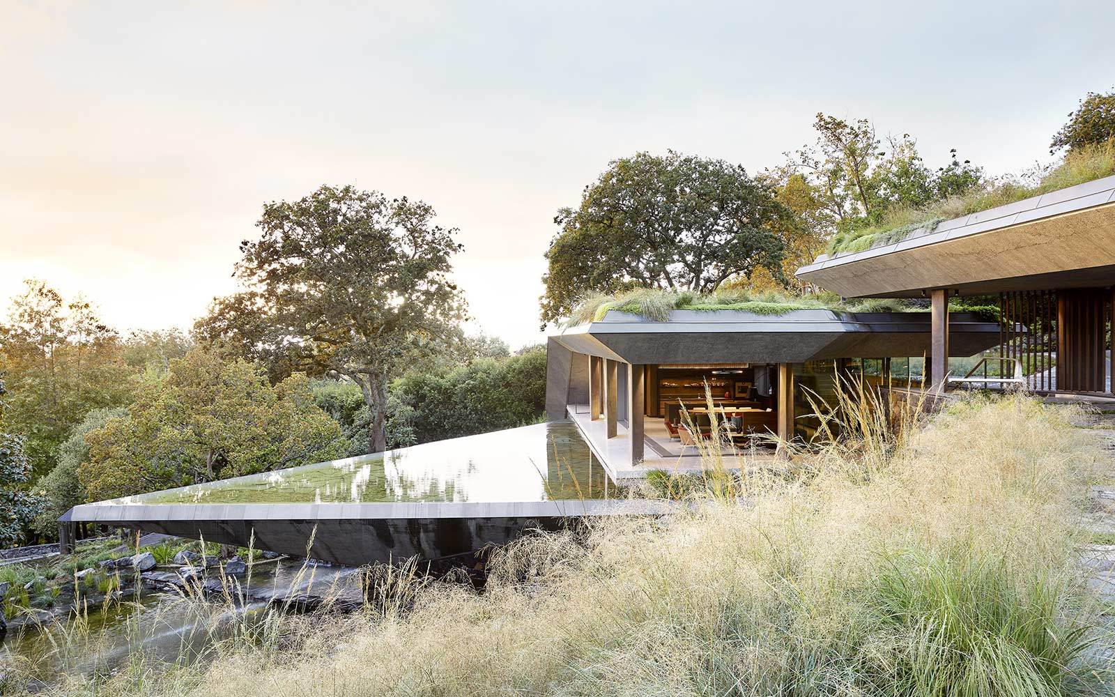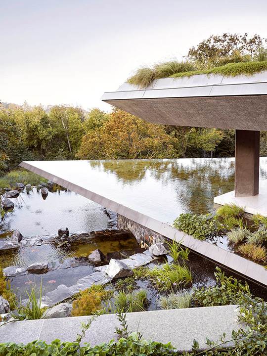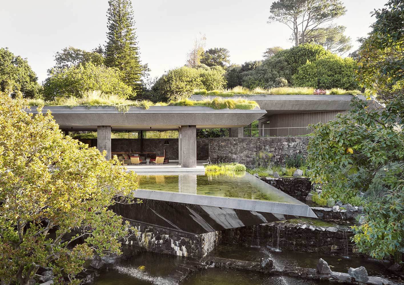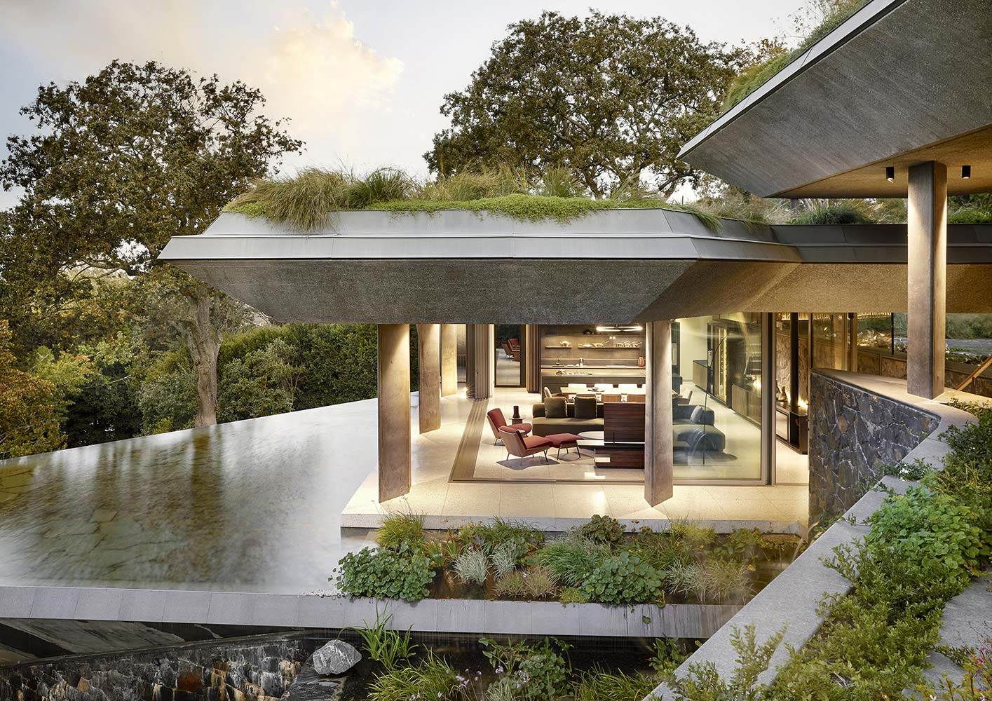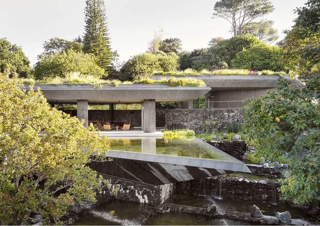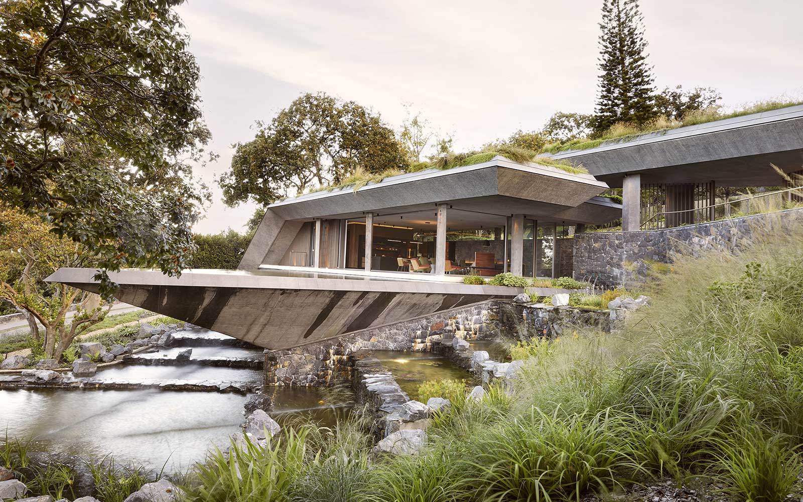 L'uso di geometrie moderne e di materiali ricercati esalta la bellezza dello scenario senza mai sovrastarlo. Il progetto non solo celebra la connessione con l'ambiente esterno, ma lo rende parte integrante dell'esperienza abitativa: le cascate seguono il pendio naturale e il movimento dell’acqua, incontrando la solidità del cemento a sbalzo, genera un contrasto che accentua la tranquillità e la maestosità del panorama, mentre il tetto, completamente ricoperto di vegetazione, ammorbidisce il profilo della struttura, esaltandone il legame con il contesto circostante. Le ampie vetrate incorniciano la vista esterna e permettono di dissolvere i confini tra spazi interni ed esterni, favorendo una continua interazione tra la casa e la natura nella quale è immersa.