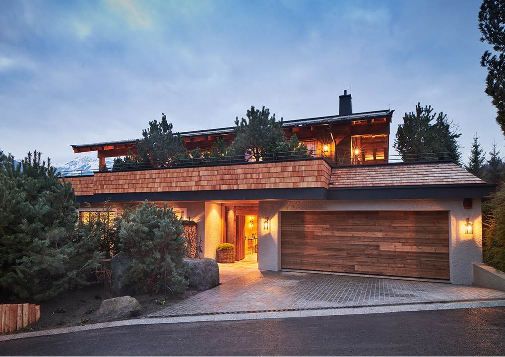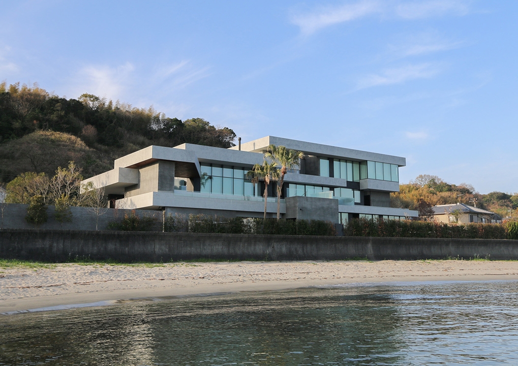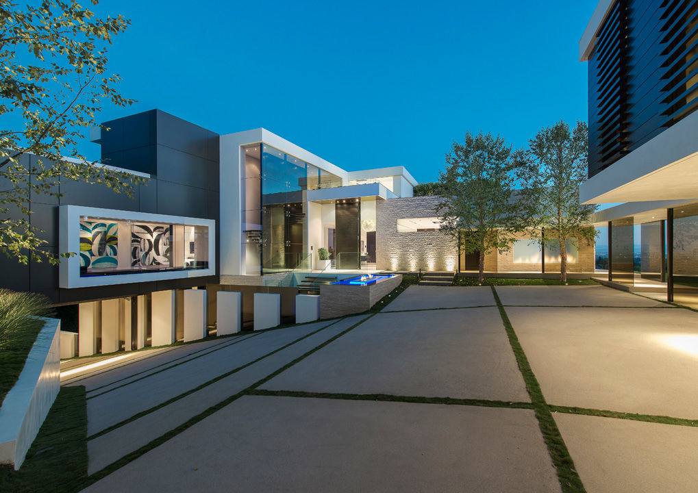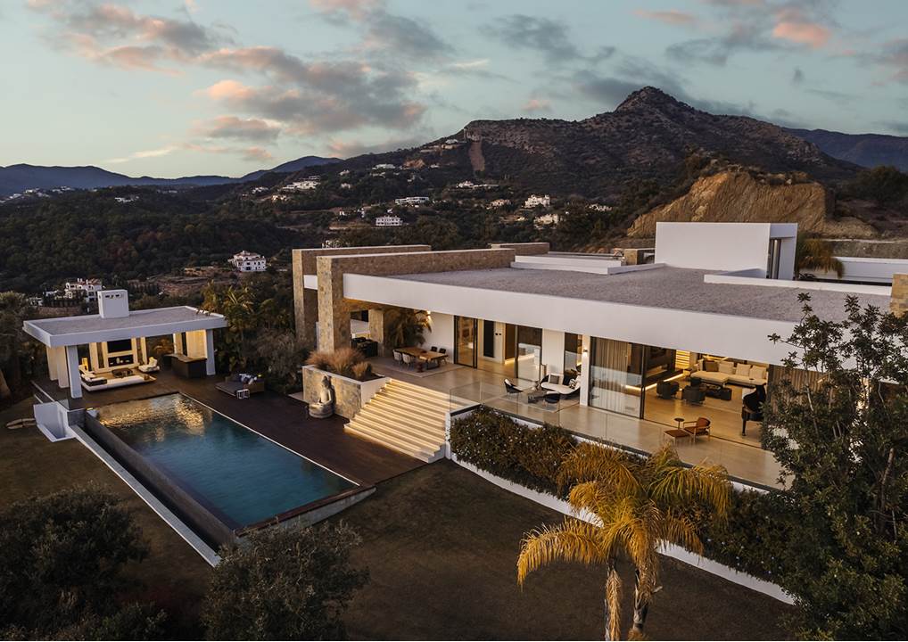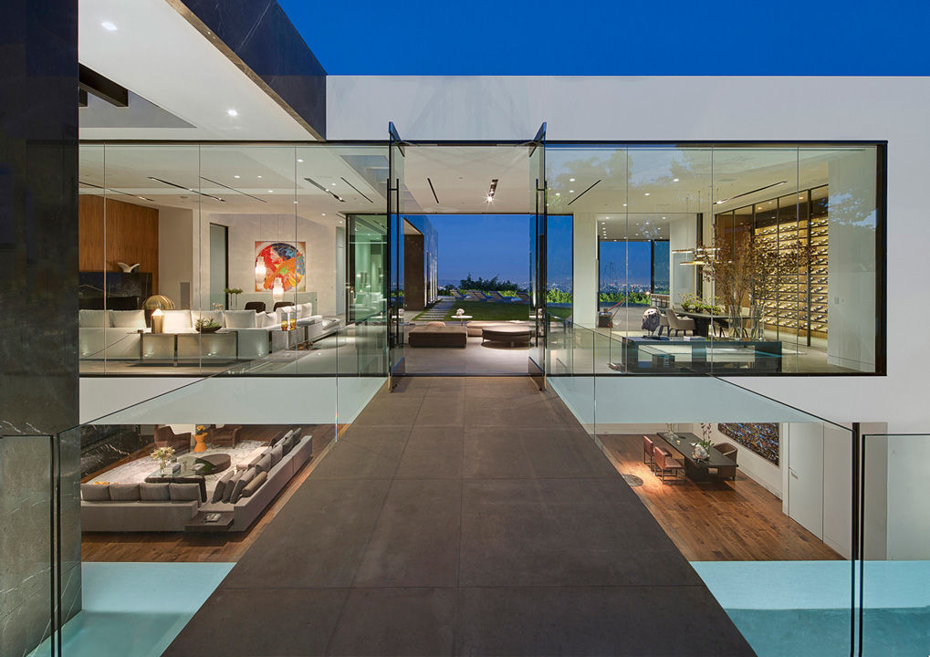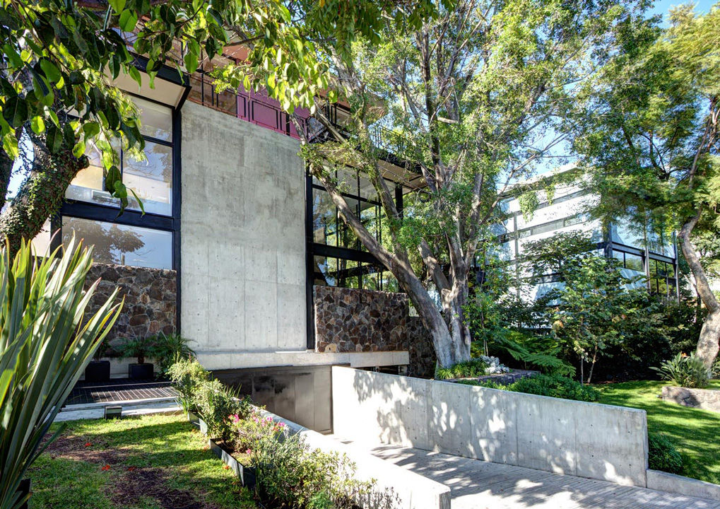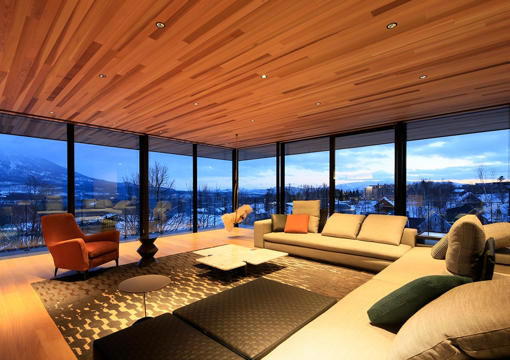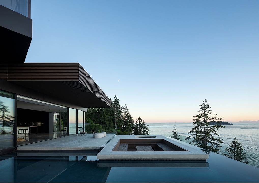 L'uso di geometrie moderne e di materiali ricercati esalta la bellezza dello scenario senza mai sovrastarlo. Il progetto non solo celebra la connessione con l'ambiente esterno, ma lo rende parte integrante dell'esperienza abitativa: le cascate seguono il pendio naturale e il movimento dell’acqua, incontrando la solidità del cemento a sbalzo, genera un contrasto che accentua la tranquillità e la maestosità del panorama, mentre il tetto, completamente ricoperto di vegetazione, ammorbidisce il profilo della struttura, esaltandone il legame con il contesto circostante. Le ampie vetrate incorniciano la vista esterna e permettono di dissolvere i confini tra spazi interni ed esterni, favorendo una continua interazione tra la casa e la natura nella quale è immersa.