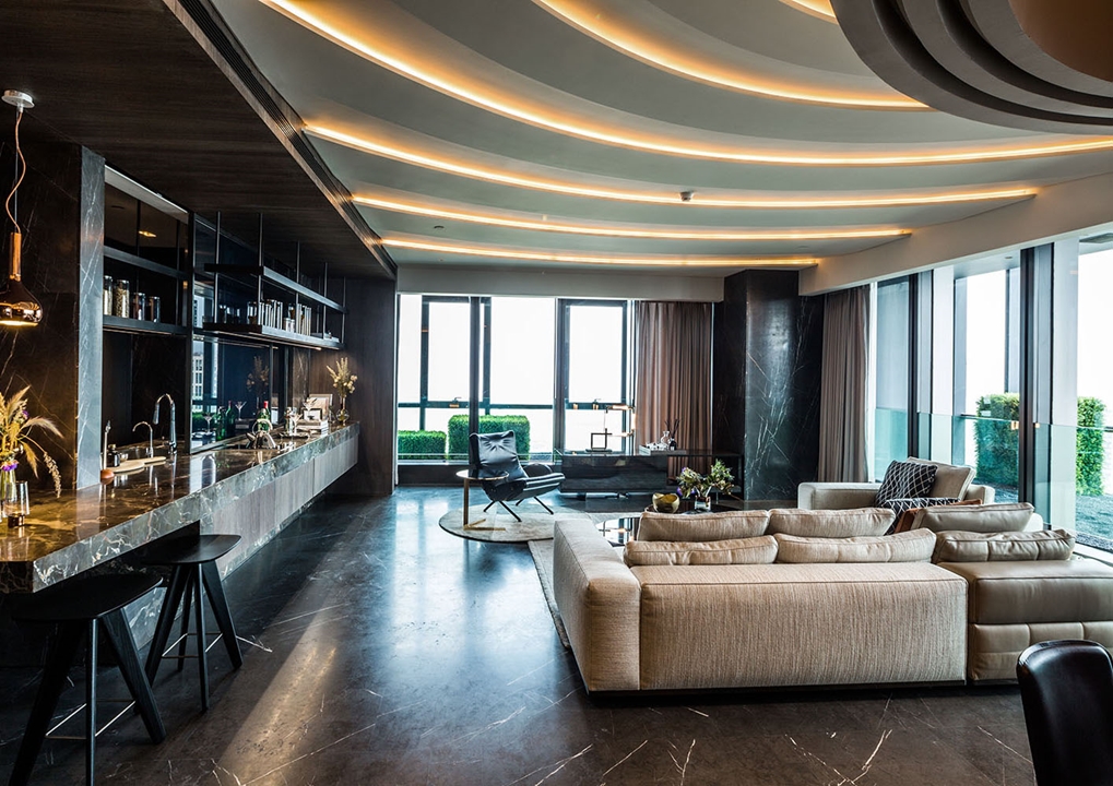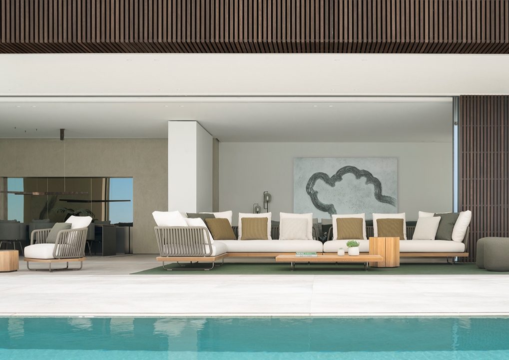 In questo quadro sofisticato, gli arredi Minotti trovano la loro perfetta collocazione, offrendo un mix di raffinatezza, comfort e funzionalità. L’iconico sistema di sedute Florida, disegnato da Rodolfo Dordoni, è protagonista della zona living grazie ai suoi volumi morbidi ed al colore verde del tessuto, che richiama la veduta esterna. A completare l’area le poltrone Daiki Outdoor, disegnate da Marcio Kogan / Studio MK27, che creano una connessione con l’adiacente zona dining. Qui, le poltroncine dining Daiki Outdoor sono accostate al tavolo Quadrado, anch’esso a firma Marcio Kogan / Studio MK27, che, grazie alla sua elegante semplicità, si presta a situazioni diverse.