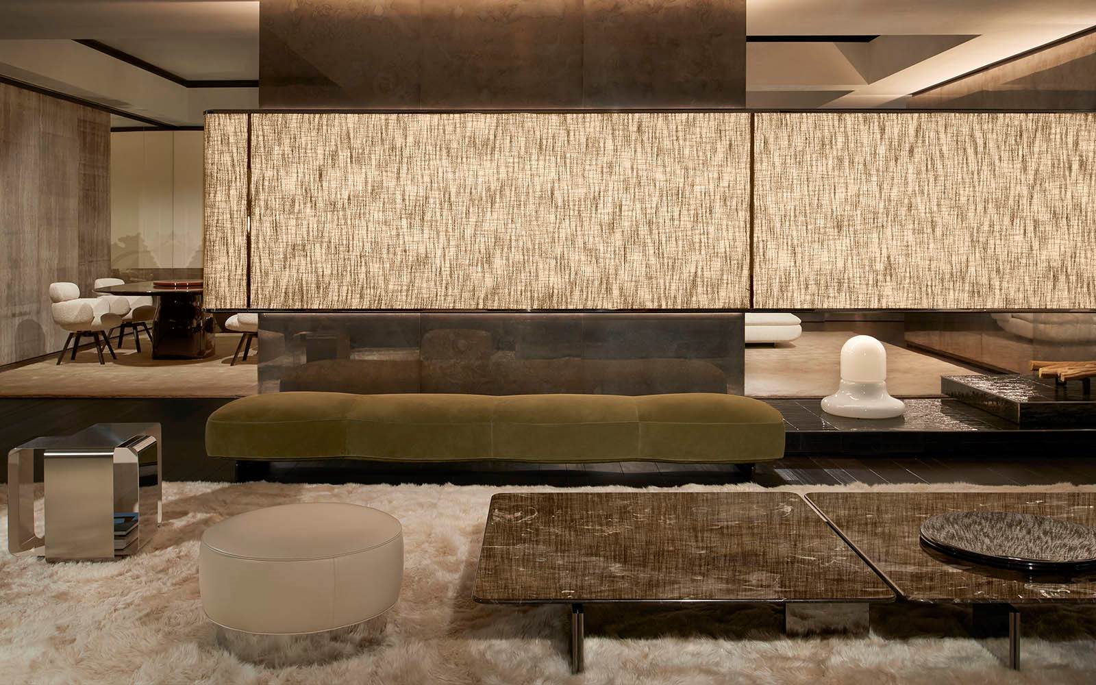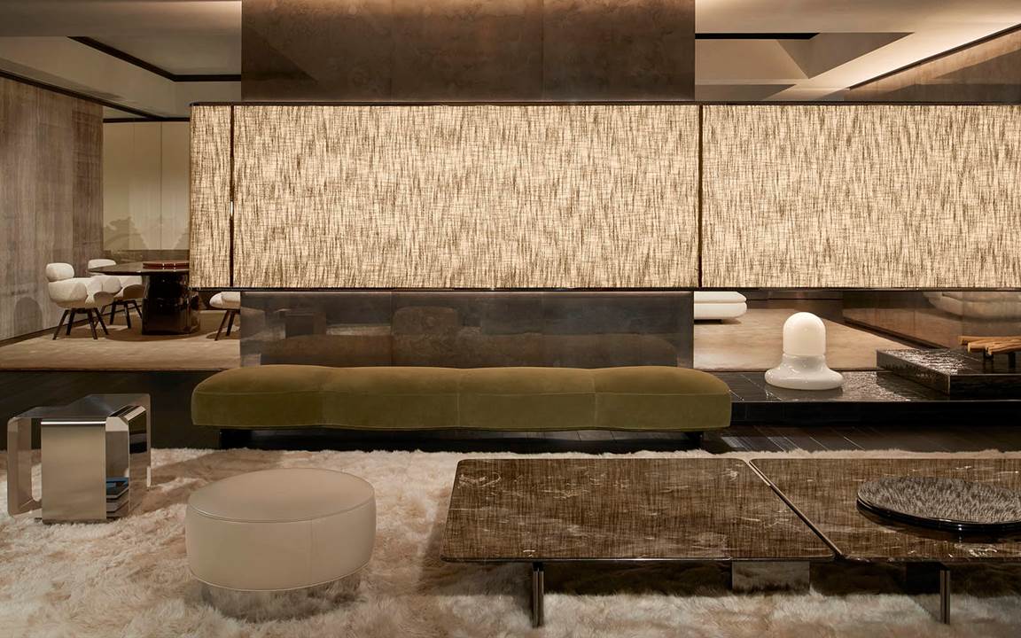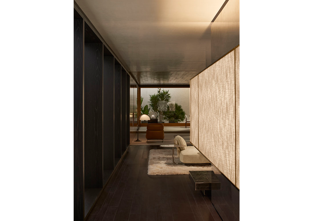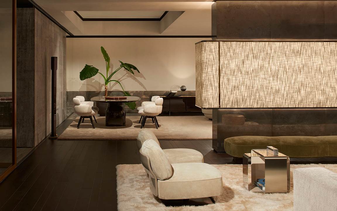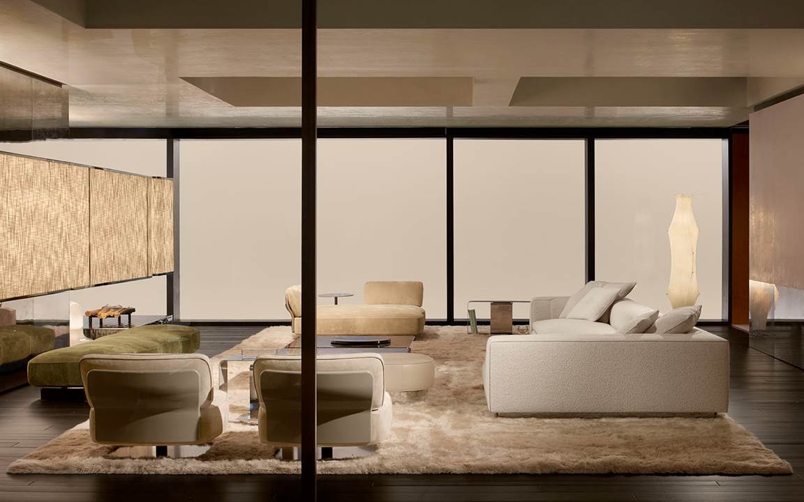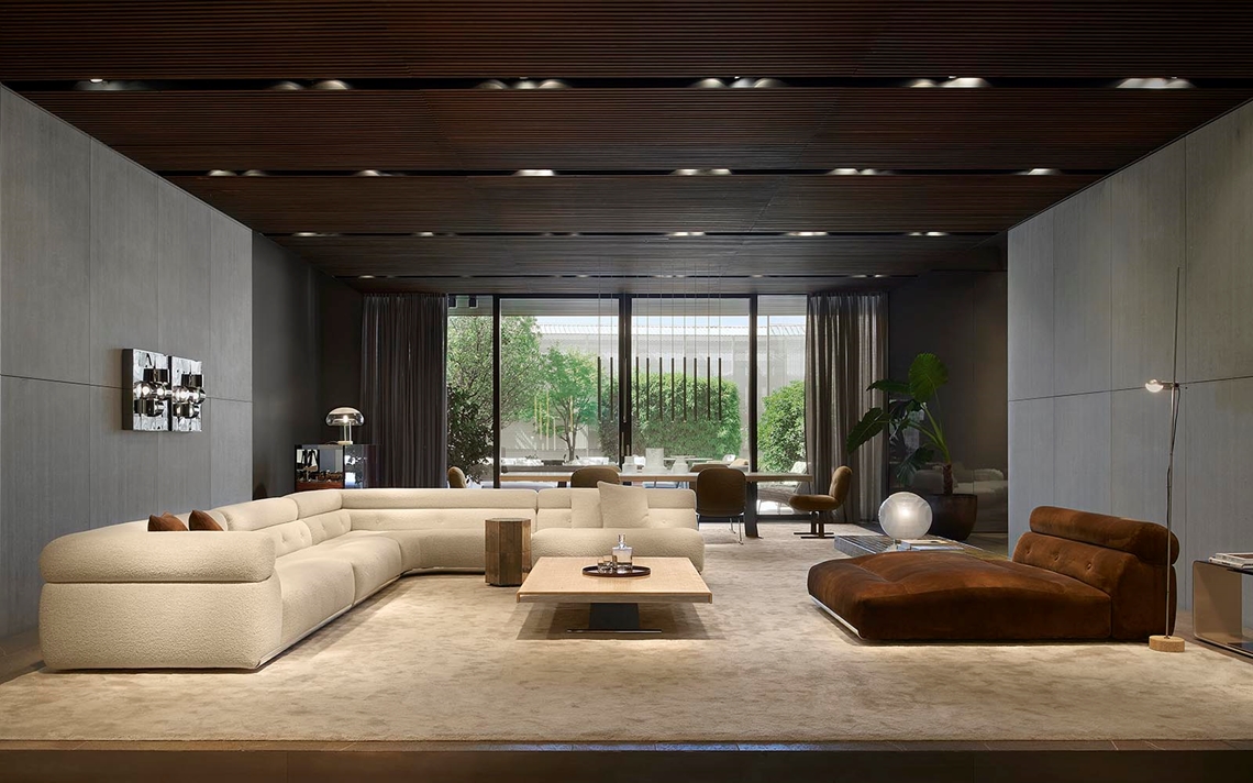 A cura di Minotti Studio, l’intera area di 1000mq si sviluppa come un unico, armonioso scenario che invita ad immergersi in una serie di eleganti ambientazioni living, dining e notte, evocando le suggestioni di ambienti residenziali e Hospitality ideali.