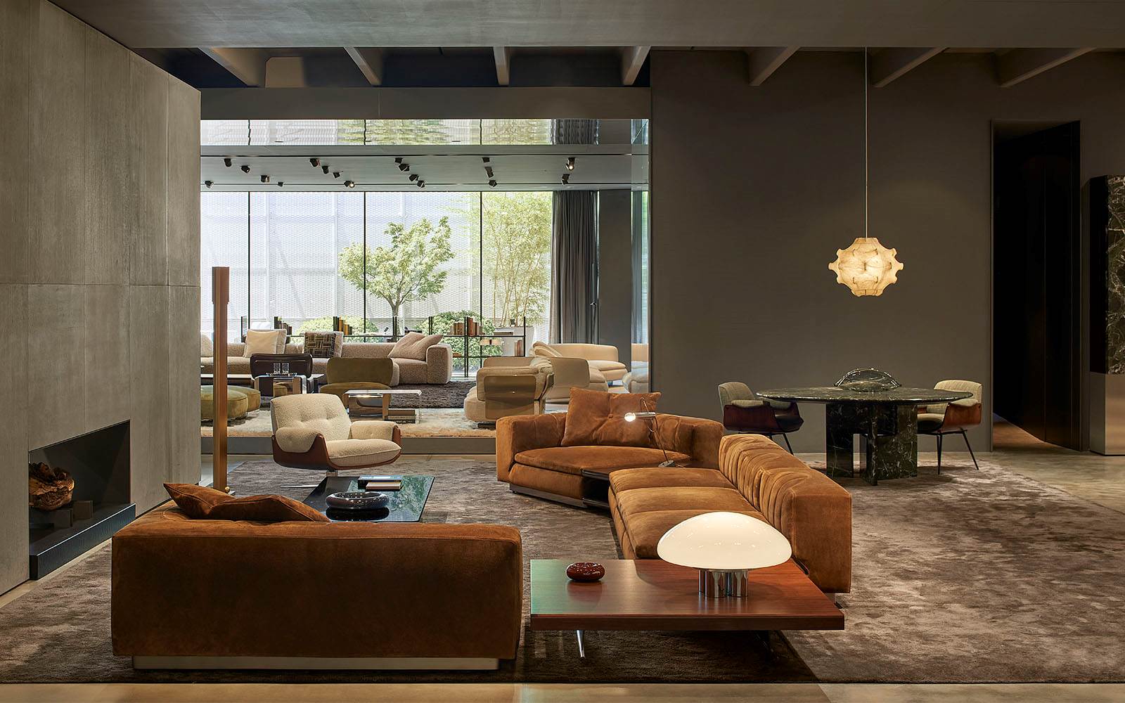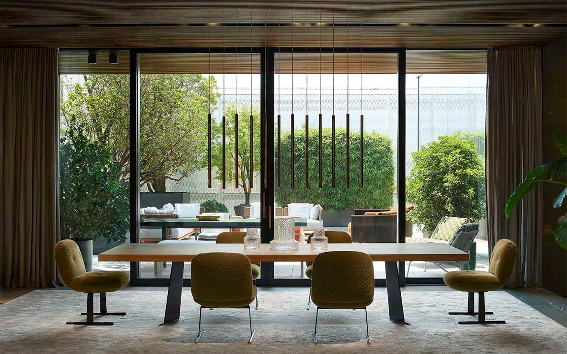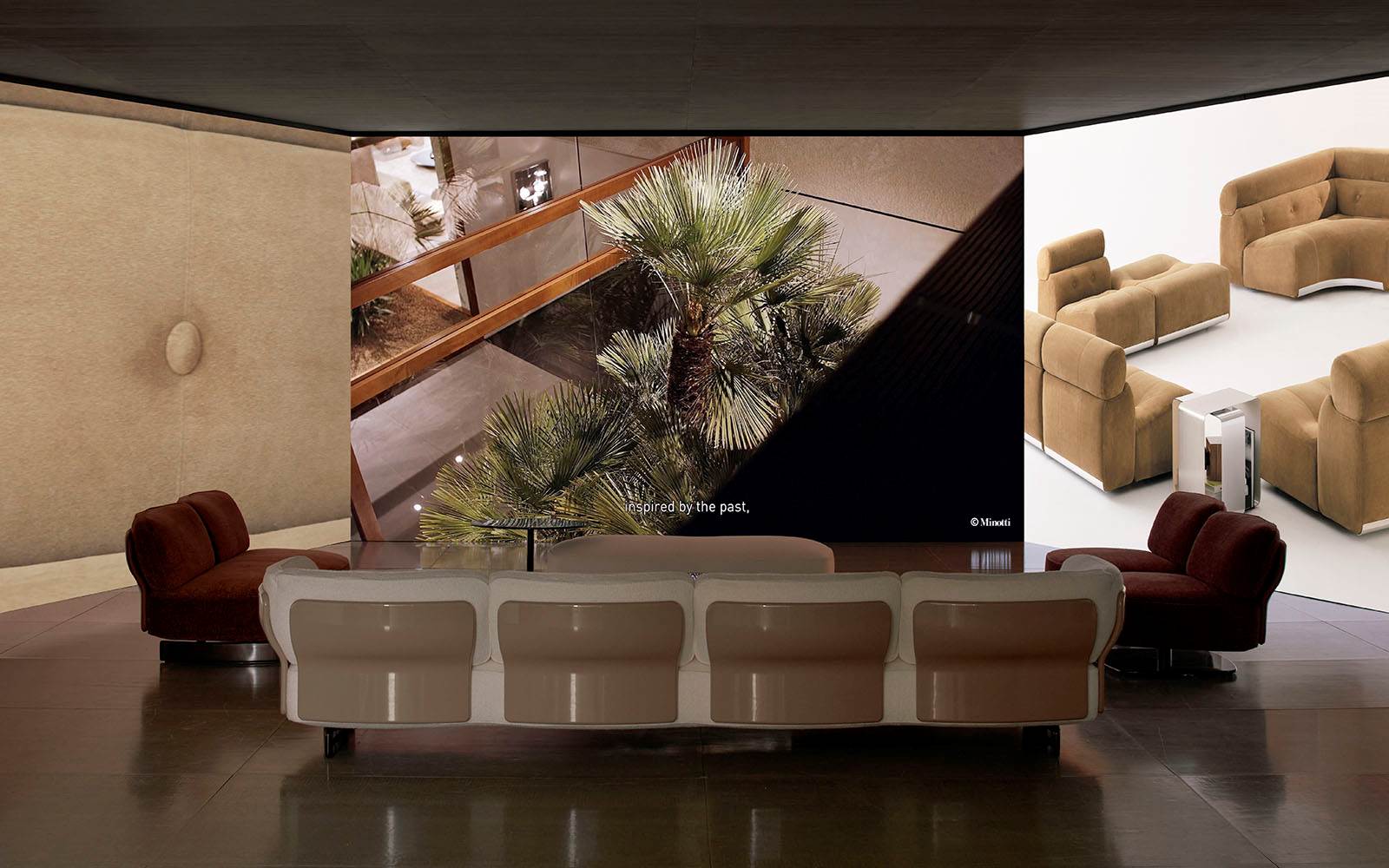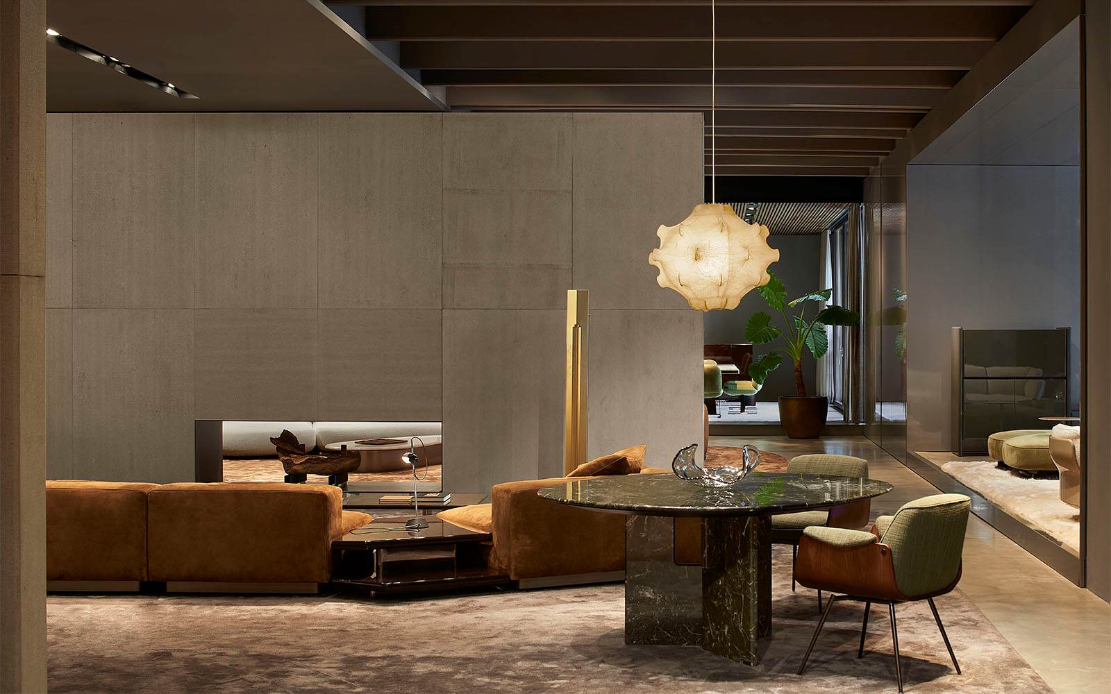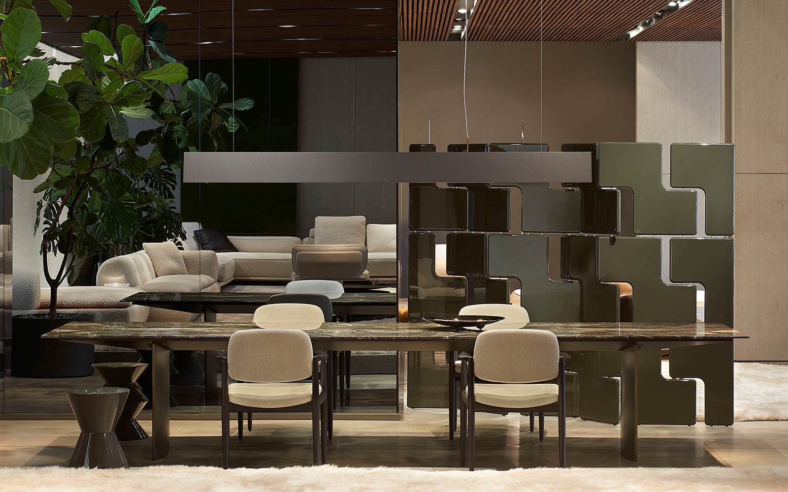 A cura di Minotti Studio, l’intera area di 1000mq si sviluppa come un unico, armonioso scenario che invita ad immergersi in una serie di eleganti ambientazioni living, dining e notte, evocando le suggestioni di ambienti residenziali e Hospitality ideali.