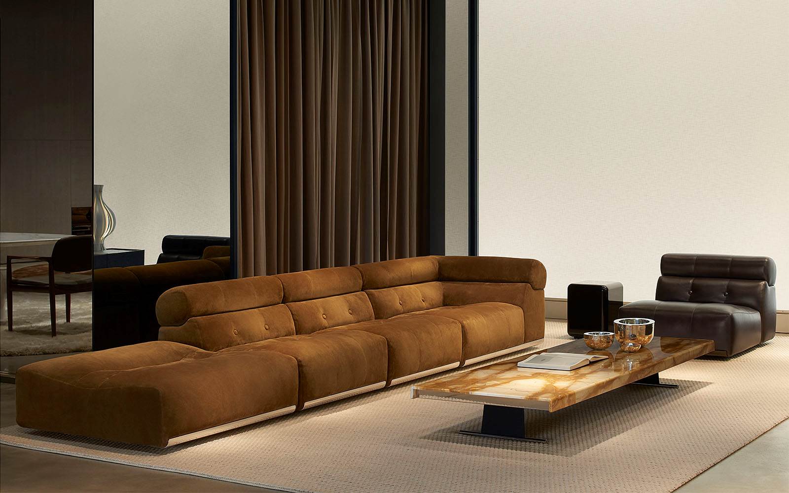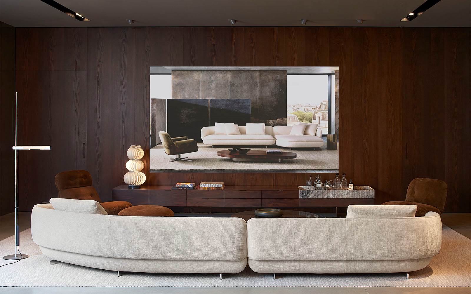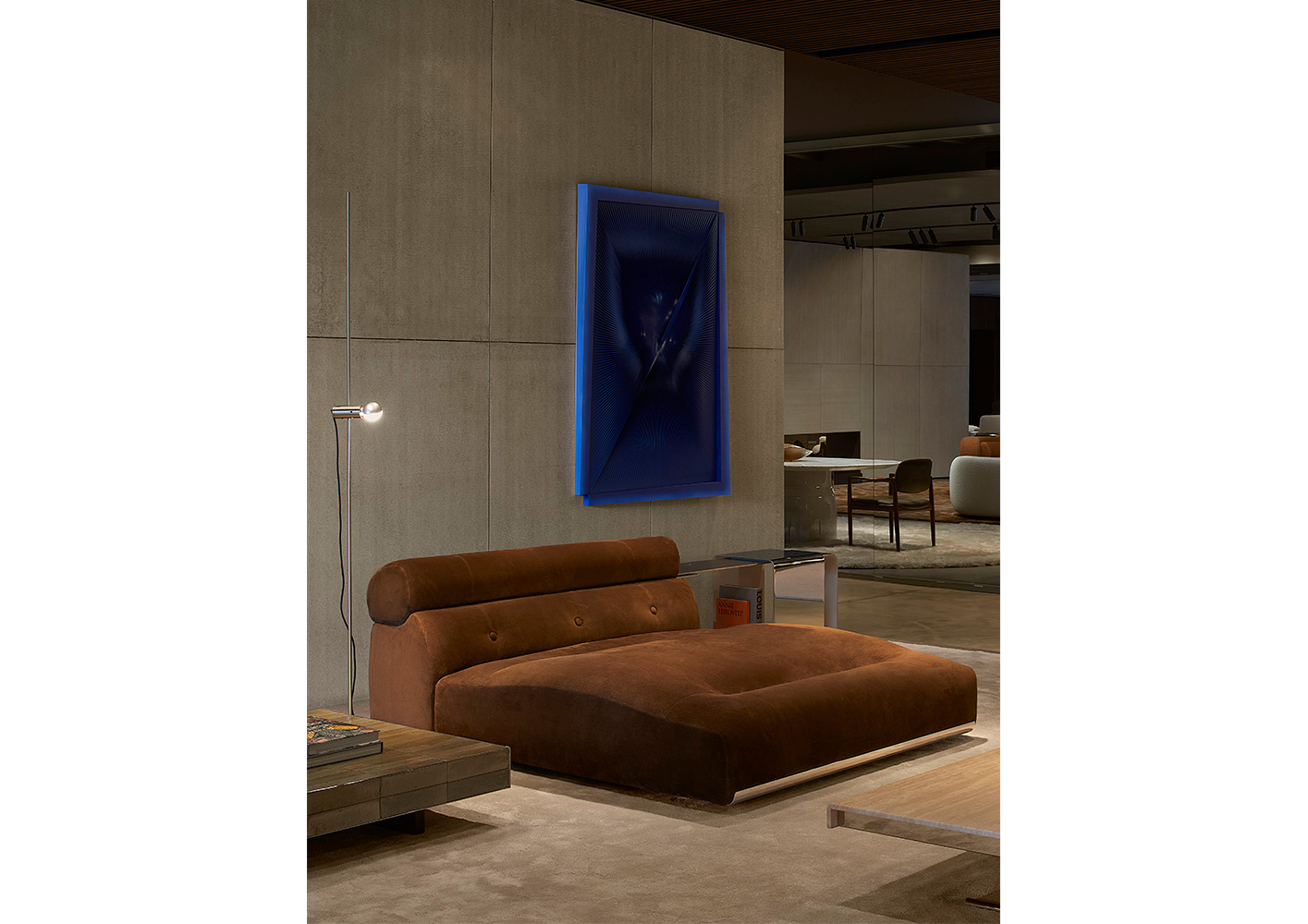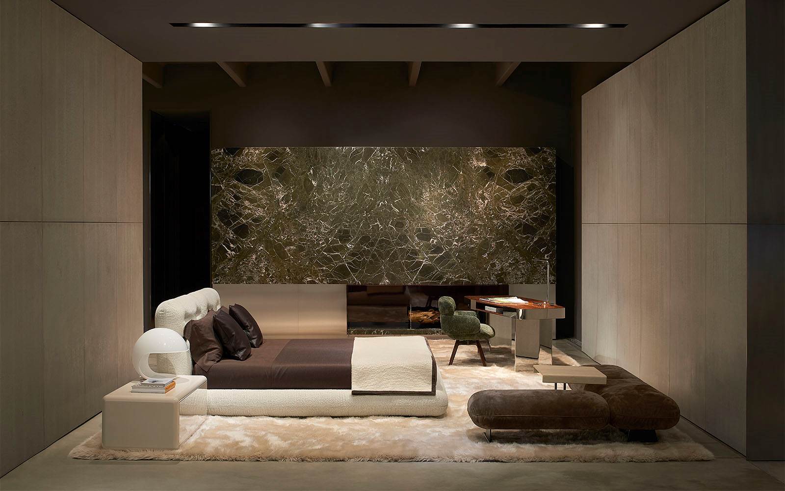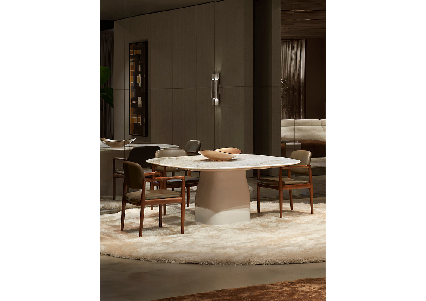 A cura di Minotti Studio, l’intera area di 1000mq si sviluppa come un unico, armonioso scenario che invita ad immergersi in una serie di eleganti ambientazioni living, dining e notte, evocando le suggestioni di ambienti residenziali e Hospitality ideali.