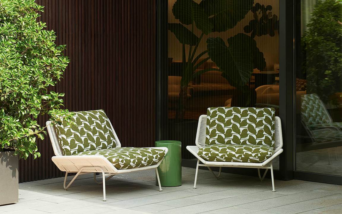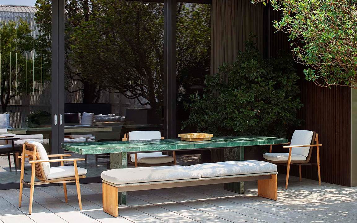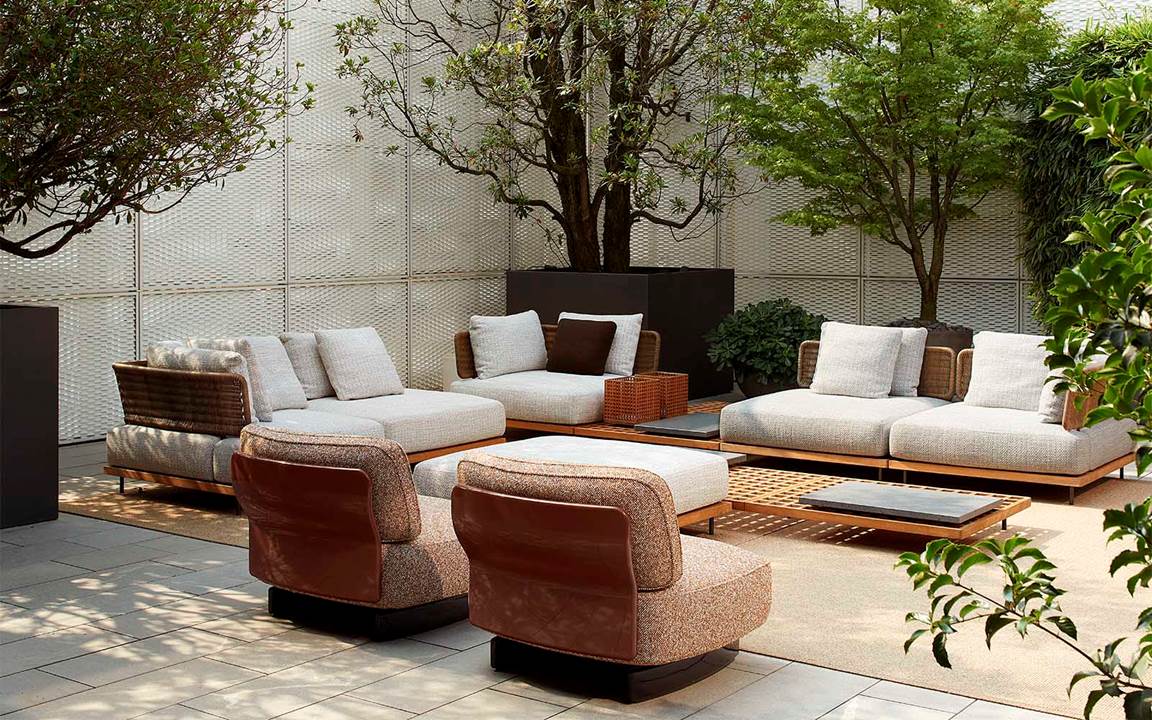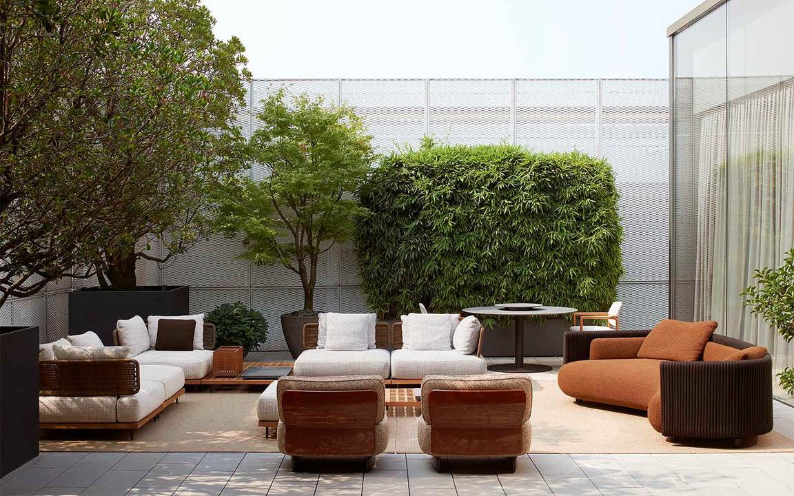 Le ampie vetrate dello spazio si affacciano sulla terrazza open-air, dove le novità outdoor della collezione, ravvivate da una palette di colori naturali, conquistano la scena, dando vita a un dialogo fluido tra interni ed esterni.