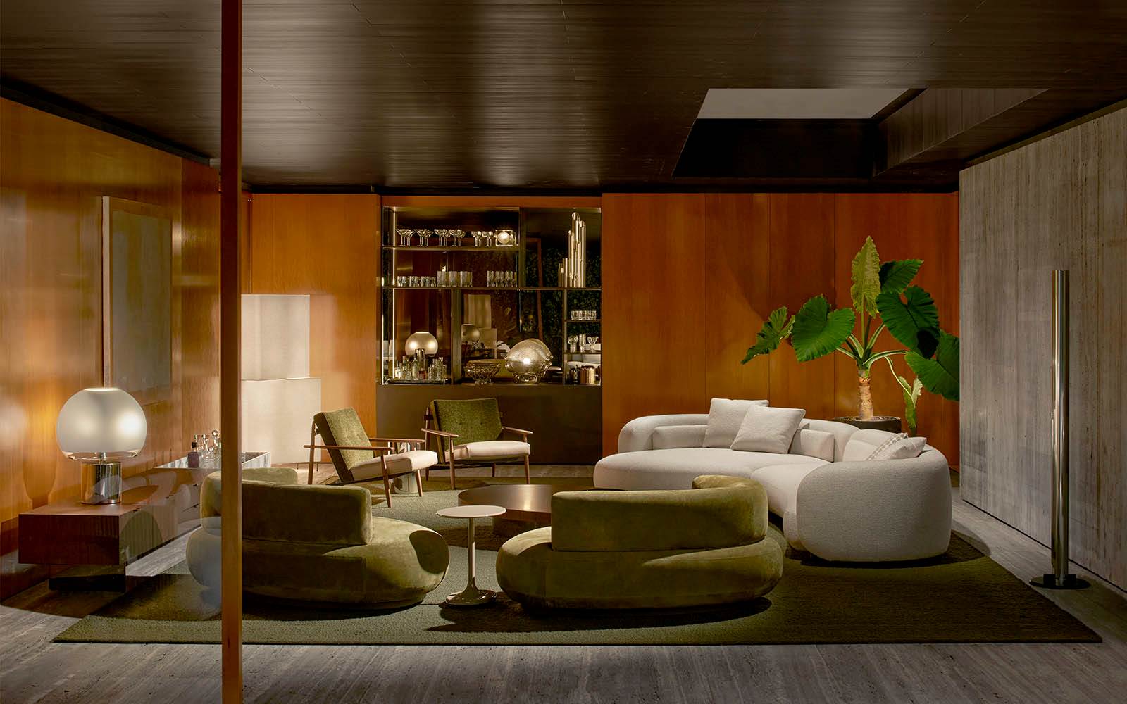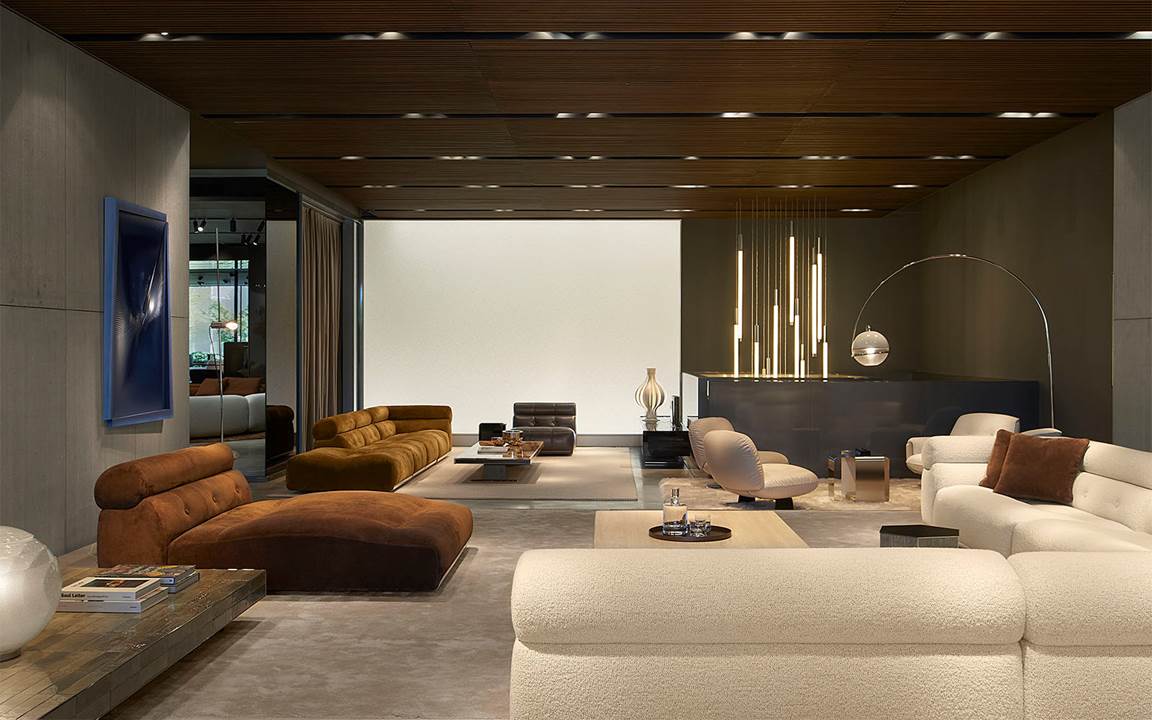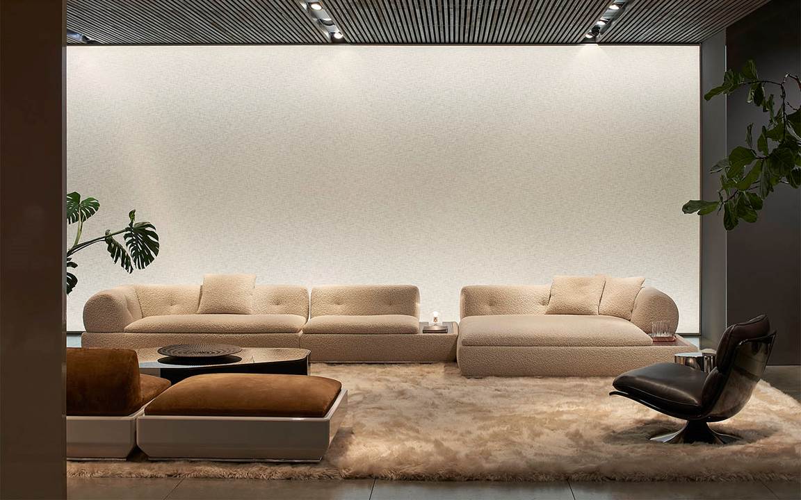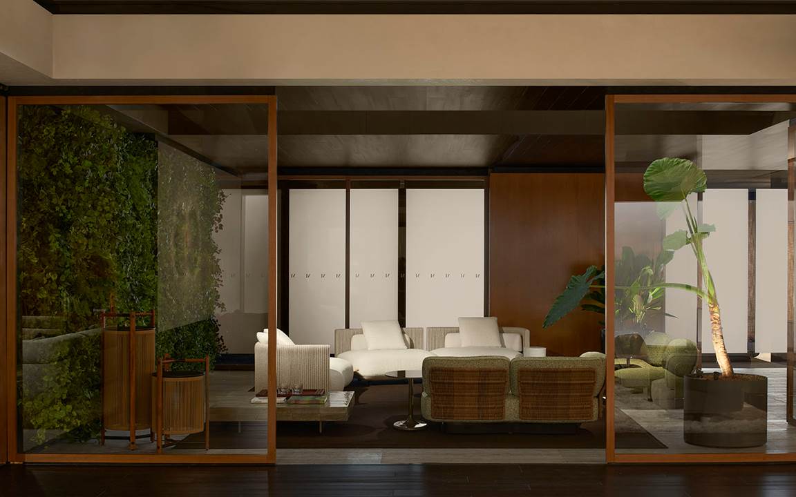Il sapiente gioco di prospettive e isole rialzate, in una cornice caratterizzata da pietra Piasentina, cemento grigio e calde boiserie in essenza, valorizza i diversi linguaggi stilistici degli arredi della 2025 Collection – tra i quali i sistemi di sedute modulari Coupé di Giampiero Tagliaferri, Bézier di Marcio Kogan / Studio MK27, Vivienne di GamFratesi, Saki di Nendo e Riley di Hannes Peer – presentati insieme ai best-sellers del brand.