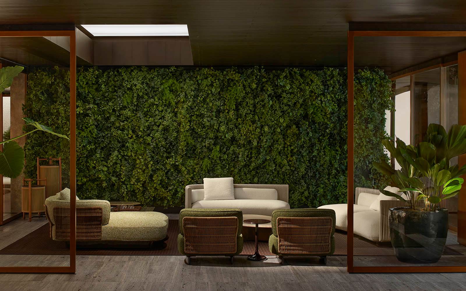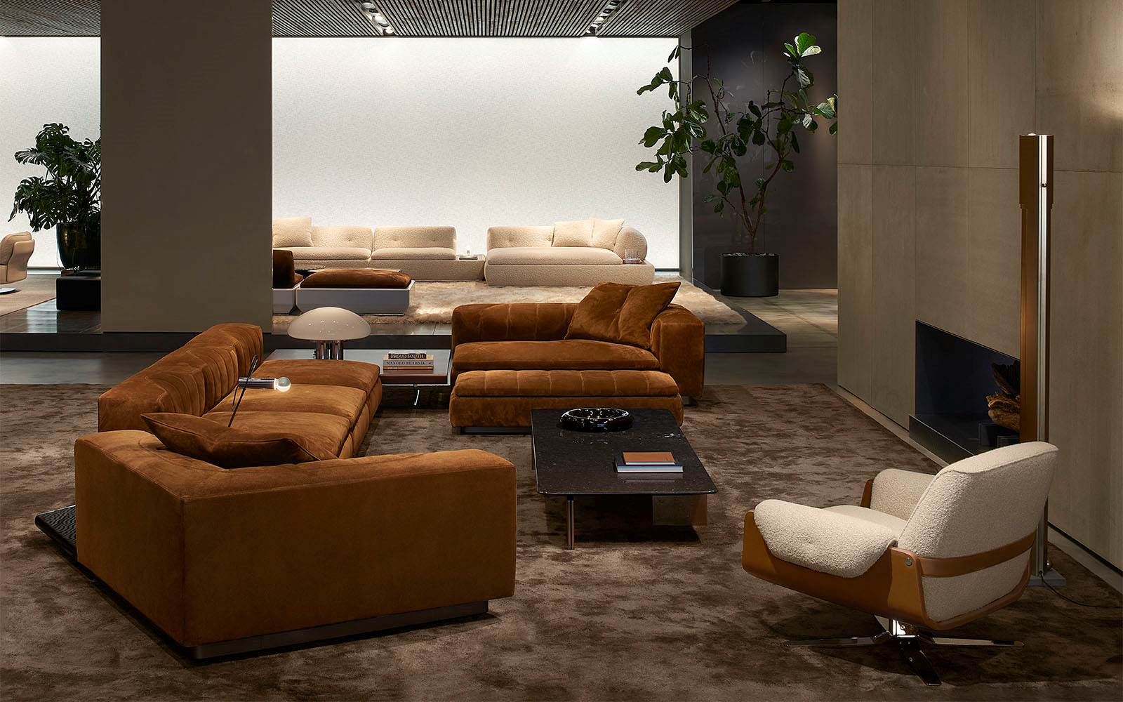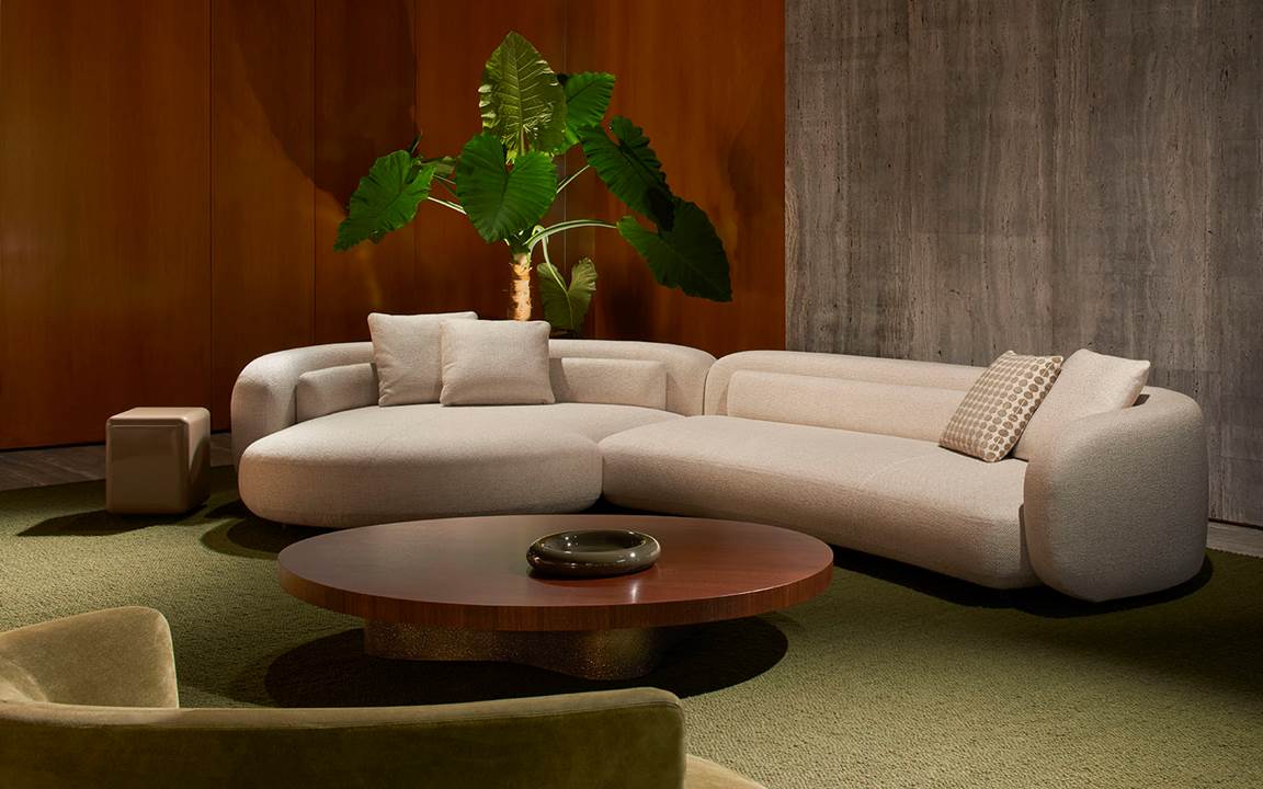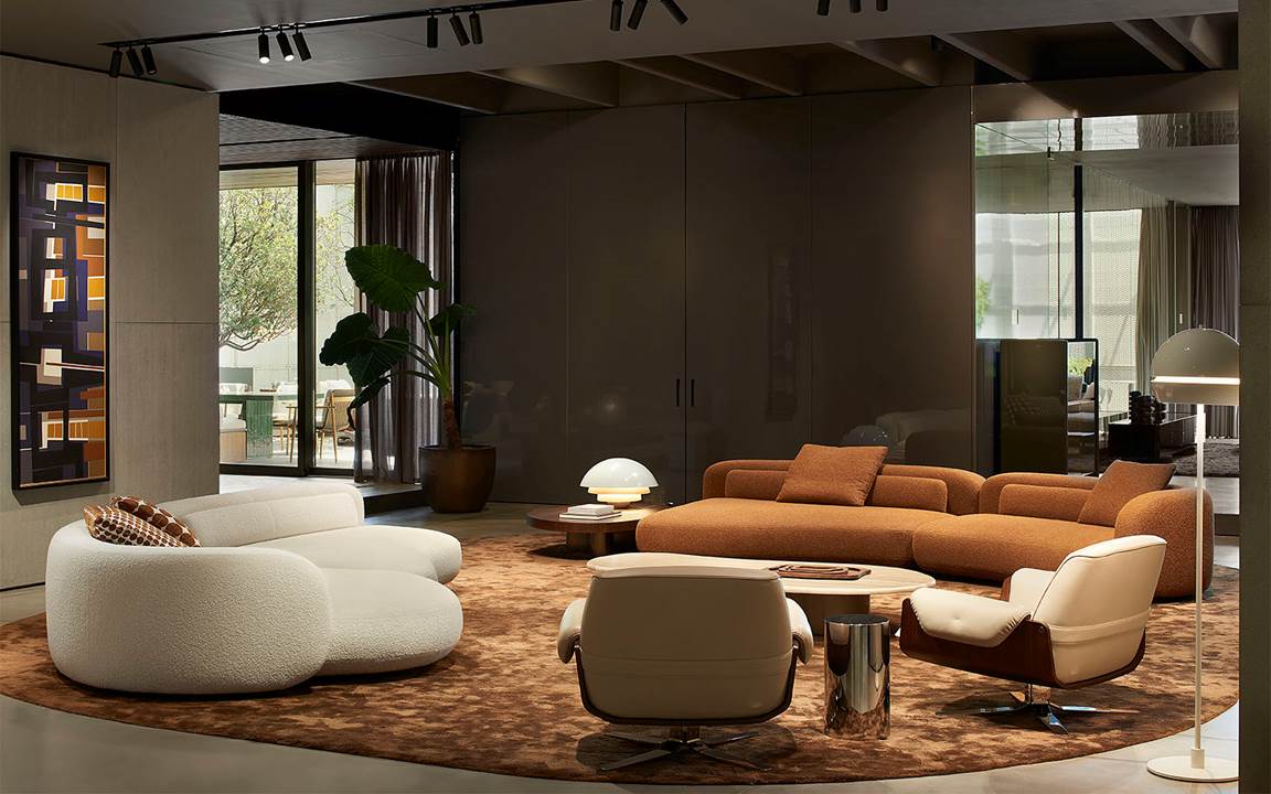 Il sapiente gioco di prospettive e isole rialzate, in una cornice caratterizzata da pietra Piasentina, cemento grigio e calde boiserie in essenza, valorizza i diversi linguaggi stilistici degli arredi della 2025 Collection – tra i quali i sistemi di sedute modulari Coupé di Giampiero Tagliaferri, Bézier di Marcio Kogan / Studio MK27, Vivienne di GamFratesi, Saki di Nendo e Riley di Hannes Peer – presentati insieme ai best-sellers del brand.