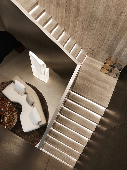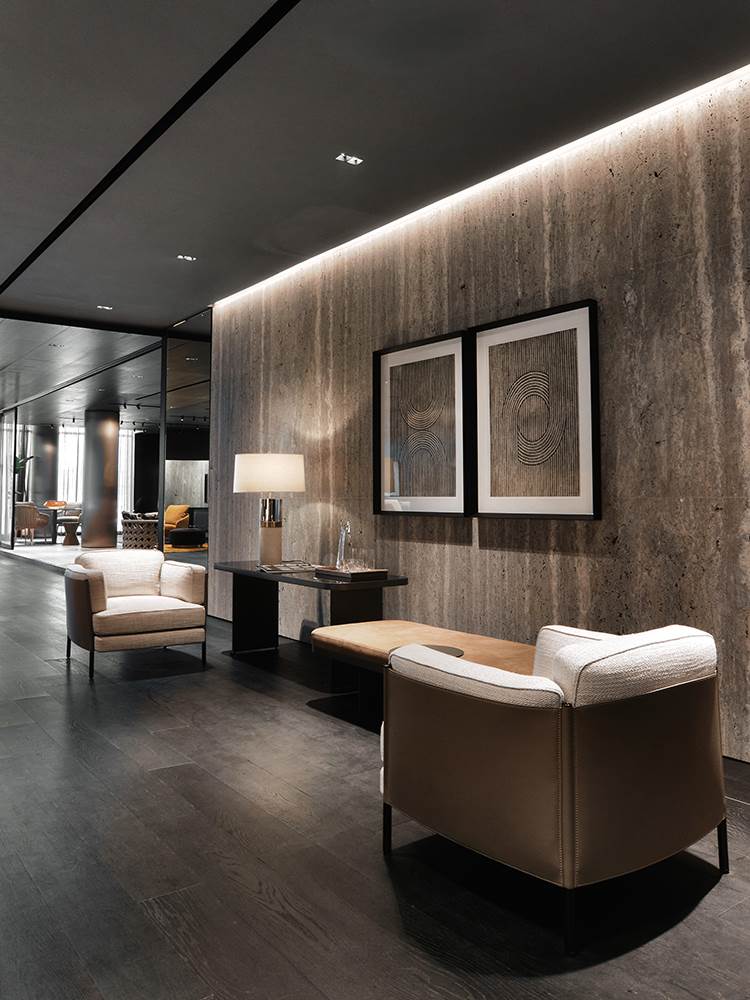 La poliedricità materica e cromatica valorizza così gli arredi protagonisti, inclusi quelli della 2024 Collection: le boiserie in rovere color moka si contrappongono al travertino silver iraniano, all’acciaio satinato e cromato riflettente, e al cemento, per una palette nelle sfumature del marrone e del grigio che esprime grande raffinatezza.