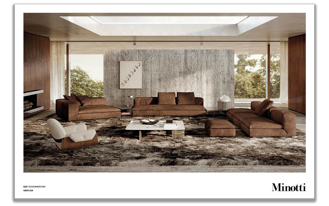 Riley, by Hannes Peer, inhabits a modern home with a timeless aesthetic, reflecting Minotti’s signature style. Its bold geometric lines, enriched with sartorial details, explore the boundaries of contemporary modernism in a continuous dialogue between memory and innovation.